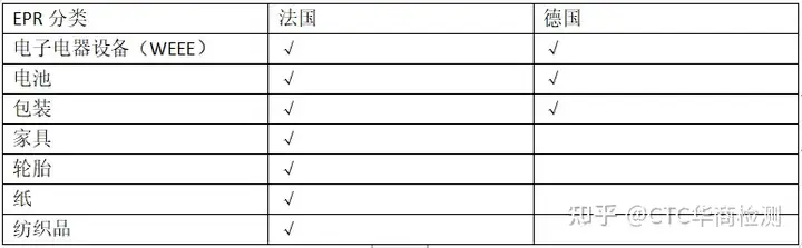 法国(7 类):包装、电子电器设备、电池、家具、轮胎、纸、纺织品。
